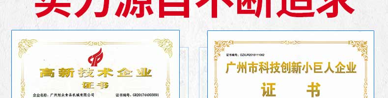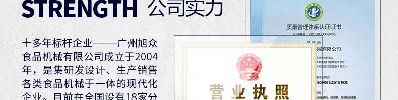 廣州旭眾食品機(jī)械有限公司是一家集科研開(kāi)發(fā),生產(chǎn)設(shè)計(jì),營(yíng)銷(xiāo)服務(wù)為一體的現(xiàn)代化生產(chǎn)企業(yè)?,F(xiàn)代化生產(chǎn)車(chē)間,精湛制造技術(shù),所產(chǎn)機(jī)械歷經(jīng)市場(chǎng)重重考驗(yàn),不斷贏得海內(nèi)外客戶的贊譽(yù)。