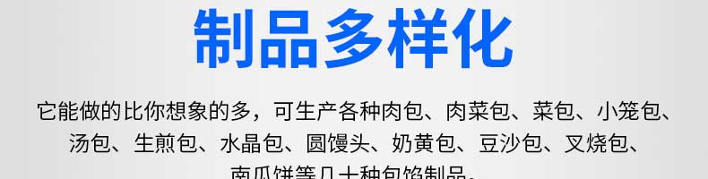 XZ-B812型多功能包子機(jī),它能做的比你想象的多,可生產(chǎn)各種肉包、肉菜包、菜包、小籠包、湯包、生煎包、水晶包、圓饅頭、奶黃包、豆沙包、叉燒包南瓜餅等幾十種包餡制品。