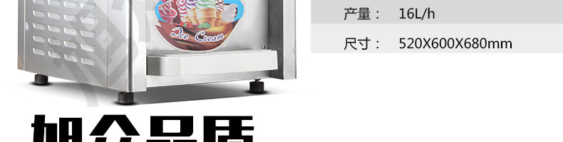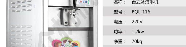 BQL-116臺(tái)式冰淇淋機(jī),●選用國際名牌成熟制冷配套件和高效壓縮機(jī),融合旭眾精湛工藝輔以嚴(yán)格的質(zhì)量控制流程,使產(chǎn)品整體性能及品質(zhì)得以全面提升?!癫捎萌珨?shù)字電腦控制系統(tǒng),選用名牌優(yōu)質(zhì)電器元件,先進(jìn)的生產(chǎn)工藝,故障診斷,軟硬任意調(diào)制,自動(dòng)修復(fù)功能,安全精確,可靠性更高?!駥I(yè)成熟制冷系統(tǒng)設(shè)計(jì),選用世界名牌大功率專用壓縮機(jī),大大縮短冰淇淋成型時(shí)間,相同時(shí)間內(nèi)冰淇淋產(chǎn)量大幅度增加,使您生意火爆時(shí)依然得心應(yīng)手,為您創(chuàng)造財(cái)富。●安全平穩(wěn)的機(jī)械攪拌系統(tǒng),噪音更低、振動(dòng)更小,使整機(jī)運(yùn)行性能達(dá)到國際先進(jìn)水平?!翊_保進(jìn)料溫度在0°C~35°C;環(huán)境溫度5°C~40°C勻可正常使用。