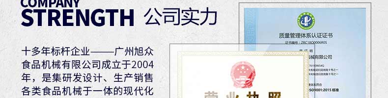 廣州旭眾食品機(jī)械有限公司是一家集科研開發(fā),生產(chǎn)設(shè)計(jì),營(yíng)銷服務(wù)為一體的現(xiàn)代化生產(chǎn)企業(yè)。現(xiàn)代化生產(chǎn)車間,精湛制造技術(shù),所產(chǎn)機(jī)械歷經(jīng)市場(chǎng)重重考驗(yàn),不斷贏得海內(nèi)外客戶的贊譽(yù)。