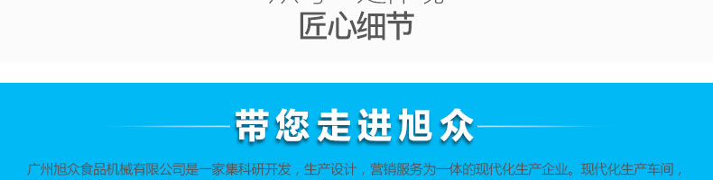 廣州旭眾食品機(jī)械有限公司是一家集科研開發(fā),生產(chǎn)設(shè)計(jì),營(yíng)銷服務(wù)為一體的現(xiàn)代化生產(chǎn)企業(yè)?,F(xiàn)代化生產(chǎn)車間,精湛制造技術(shù),所產(chǎn)機(jī)械歷經(jīng)市場(chǎng)重重考驗(yàn),不斷贏得海內(nèi)外客戶的贊譽(yù)。