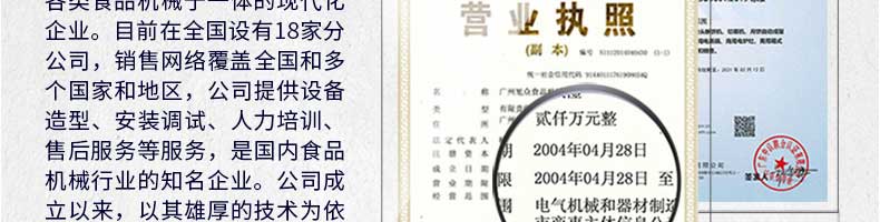 廣州旭眾食品機械有限公司是一家集科研開發(fā),生產(chǎn)設計,營銷服務為一體的現(xiàn)代化生產(chǎn)企業(yè)?,F(xiàn)代化生產(chǎn)車間,精湛制造技術,所產(chǎn)機械歷經(jīng)市場重重考驗,不斷贏得海內外客戶的贊譽。