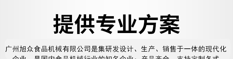 廣州旭眾食品機(jī)械有限公司是一家集科研開(kāi)發(fā),生產(chǎn)設(shè)計(jì),營(yíng)銷服務(wù)為一體的現(xiàn)代化生產(chǎn)企業(yè)?,F(xiàn)代化生產(chǎn)車間,精湛制造技術(shù),所產(chǎn)機(jī)械歷經(jīng)市場(chǎng)重重考驗(yàn),不斷贏得海內(nèi)外客戶的贊譽(yù)。