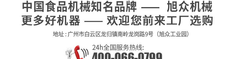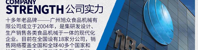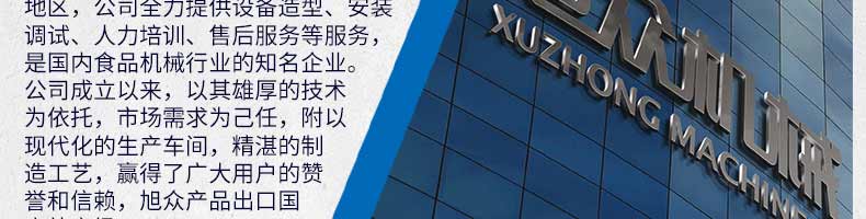 廣州旭眾食品機(jī)械有限公司是一家集科研開(kāi)發(fā),生產(chǎn)設(shè)計(jì),營(yíng)銷(xiāo)服務(wù)為一體的現(xiàn)代化生產(chǎn)企業(yè)?,F(xiàn)代化生產(chǎn)車(chē)間,精湛制造技術(shù),所產(chǎn)機(jī)械歷經(jīng)市場(chǎng)重重考驗(yàn),不斷贏得海內(nèi)外客戶的贊譽(yù)。