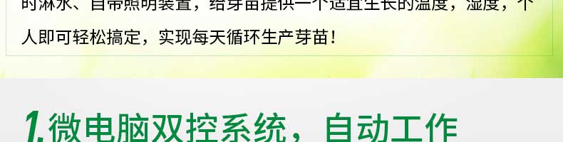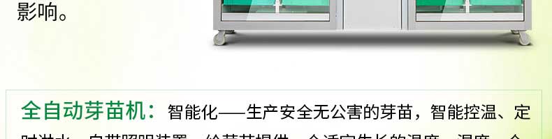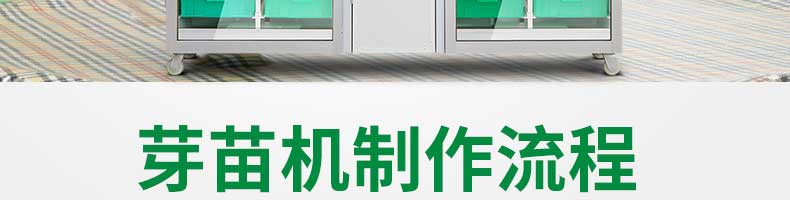 芽苗機系列,全自動芽苗機:智能化一生產(chǎn)安全無公害的芽苗,智能控溫、定時淋水、自帶照明裝置,給芽苗提供一個適宜生長的溫度,濕度,個人即可輕松搞定,實現(xiàn)每天循環(huán)生產(chǎn)芽苗!