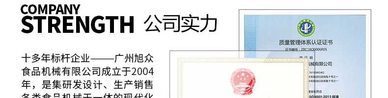 廣州旭眾食品機械有限公司是一家集科研開發(fā),生產(chǎn)設計,營銷服務為一體的現(xiàn)代化生產(chǎn)企業(yè)。現(xiàn)代化生產(chǎn)車間,精湛制造技術,所產(chǎn)機械歷經(jīng)市場重重考驗,不斷贏得海內外客戶的贊譽。